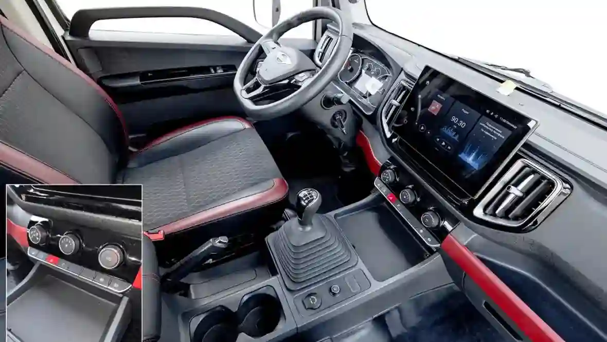 Интерьер кабины: система кондиционирования воздуха, многофункциональное рулевое колесо, рулевая колонка регулируется по высоте и углу наклона, русифицированная мультимедийная система с камерой заднего вида и поддержкой протокола Bluetooth