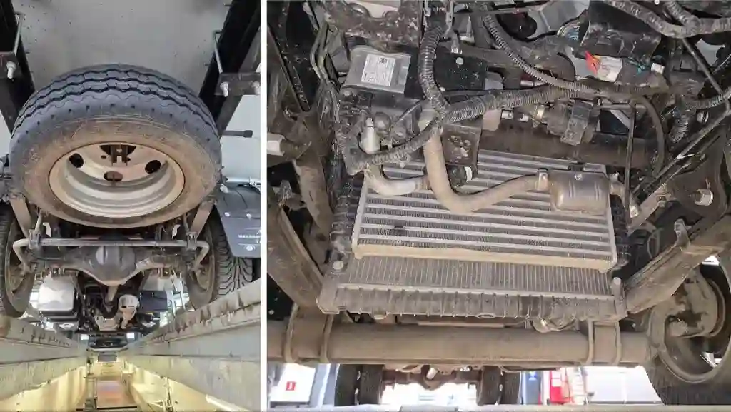 Запаска располагается в заднем свесе под кузовом. Ведущий мост снабдили стабилизатором поперечной устойчивости, что высокому фургону явно не помешает
