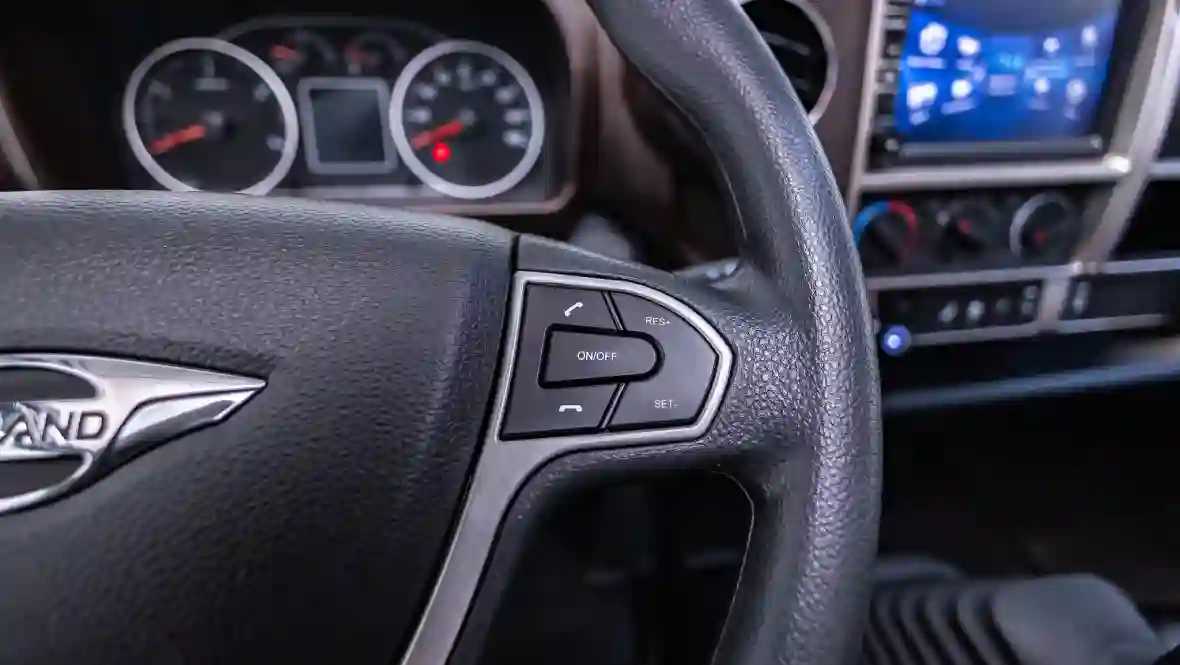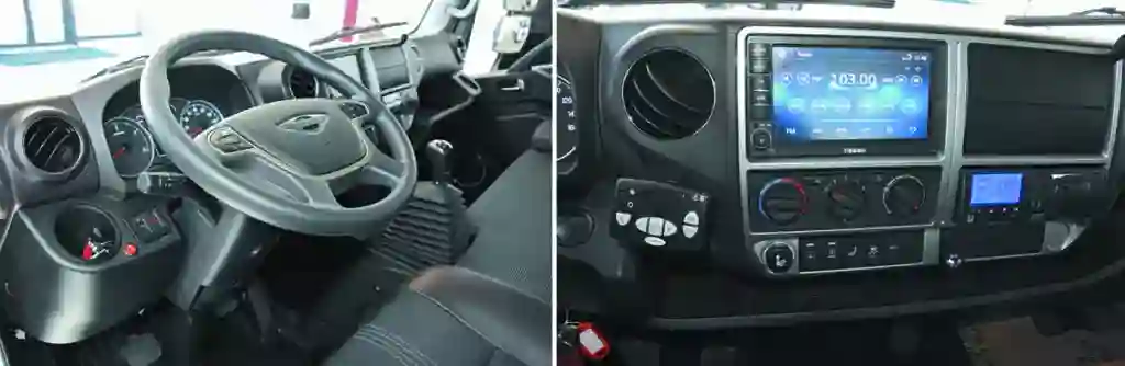 Водительское кресло подпружинено – полезная штука для автомобиля, где шофер сидит практически «на переднем колесе». Руль с вынесенными на него кнопками, регулируется по наклону и вылету. Диапазон регулировок достаточно большой, что позволяет разместиться на рабочем месте водителю «героических» размеров. Частенько китайские (да и прочие азиатские) грузовички бывают откровенно тесными, но это не про FORLAND 8. Обзор из кабины шикарный: огромная площадь остекления и зеркала, которыми машина увешана, как новогодняя елка игрушками, плюс камера заднего вида, изображение от которой выводится на дисплей, расположенный в центре передней панели.